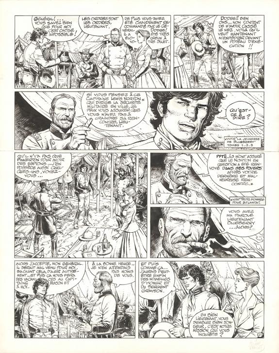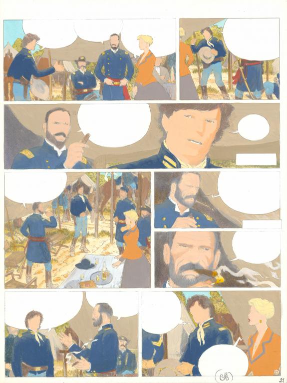 > Catalogue > Michel Blanc-Dumont > La Jeunesse de Blueberry > La solution Pinkerton > Planche originale n°21 accompagnée de sa mise en couleurs, présence de rustines en case 5